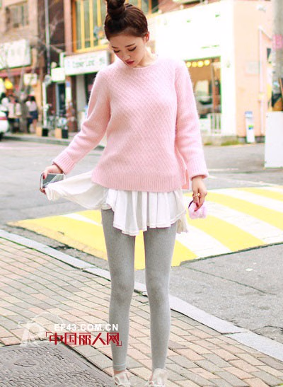 粉色套头毛衣俏皮可爱,十分减龄哦。内衬白色打底裙,突显层次感。灰色紧身打底裤保暖的同时又塑造出修长的腿型。
