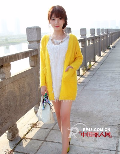 鲜亮的黄色毛衣外套搭配白色羽毛连衣裙,苹果绿平底鞋,高雅贵气,名媛千金范儿,一身温婉色系,给人的感觉很舒服。
