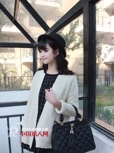 白色毛衣外套,简单百搭款式,素雅清新的风格,有种邻家女孩的气质,搭配黑白格子连衣裙,配上黑丝袜和高跟短靴,淑女范儿。