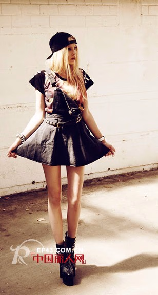 背带短裙甜美而略显低龄,潮流达人当然不满足于低龄的小女孩造型,反扣一顶黑色棒球帽,,马上从girlish变成boyish,俏皮又不失可爱。
