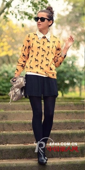 黄底马形印花套头毛衣,内搭白色衬衫,下穿黑色小短裙。