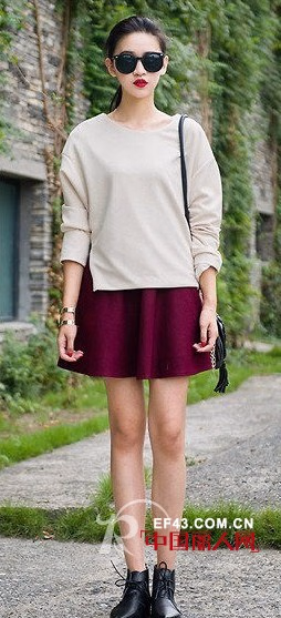 针织毛衣搭配酒红色微喇短裙,简约时尚。