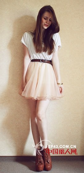 简单的纯白色T恤,搭配起一件质感破好的雪纺短裙,短裙裙摆层次设计精致,在色彩过于素雅的搭配中,腰带可是个必须品,同时搭配的系带厚底短靴与腰带色彩呼应,整体风格简约又清新。