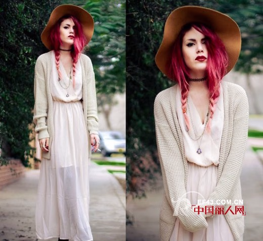 雪纺长裙外搭一件开衫的针织毛外套,色彩相近,小皮靴增添了一份帅气,宽檐帽是亮点。