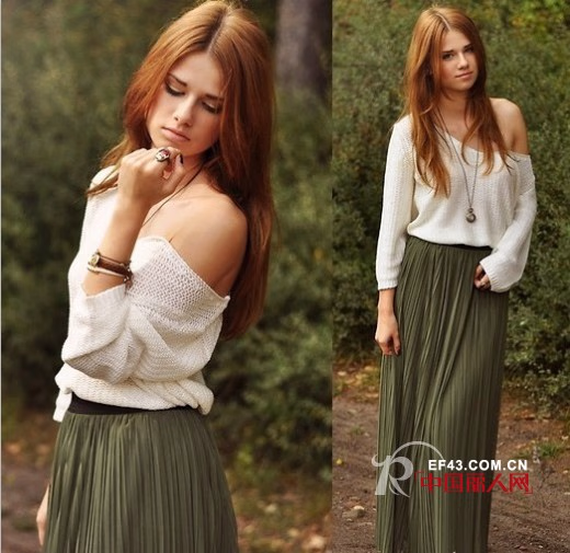 露肩针织上衣下搭藻绿色百褶长裙,裙子垂感感好,整体风格十分清新自然,透着一点小性感。