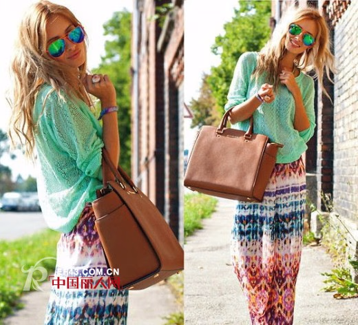 七分袖的薄针织上衣,下搭一条开叉雪纺印花长裙,上衣宽松,腰间系有腰带,整体风格实在是让小编倾心。