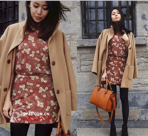 印花连衣短裙,外搭驼色呢绒大外套,浅棕色手提包为整体提亮了色彩感。