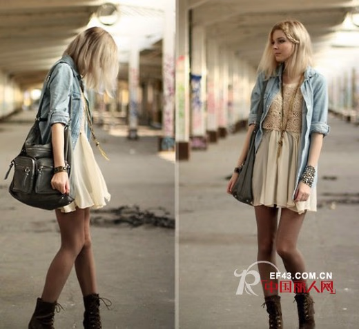 白色蕾丝雪纺连衣短裙,外搭牛仔小衬衫,经典到快烂了的搭配了,这个再不会你真得要out了哦。