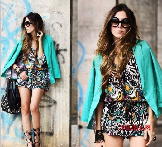印花连衣短裙,外搭亮绿色西装小外套,罗马系带高跟鞋十分别致。