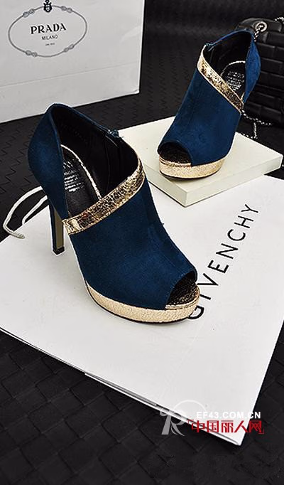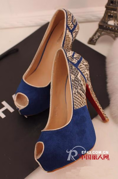 这款蓝色的蛇纹拼色的小鱼嘴性感高跟单鞋,个性时尚,欧美风范十足。在蛇年里运用到蛇元素的时尚单品,绝对够潮。