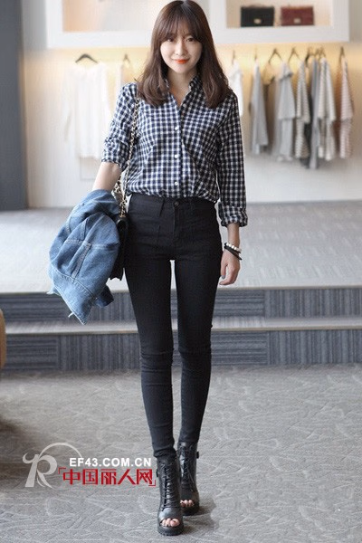 格子衬衫尽显英伦学院风。黑色紧身裤修身效果极佳。束衫令整体造型更端庄。黑色鱼嘴短靴帅气中带几分妩媚。