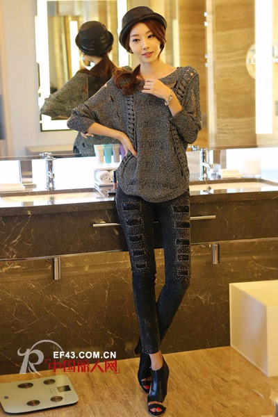 宽松的黑色针织衫尽显优雅大方,编织独特,彰显个性。紧身牛仔裤突显独特时尚感。鱼嘴短靴帅气十足。