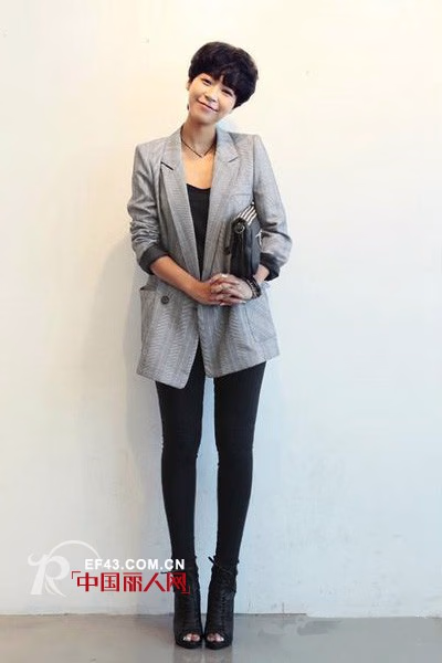 灰色小西装打破传统职场女性装扮的沉闷和单调,尽显优雅高贵。黑色紧身裤搭配黑色鱼嘴短靴,令身材更显高挑。