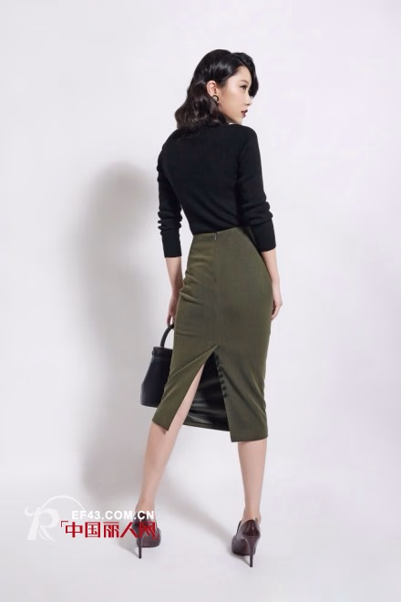 秋冬也不能没有裙子,黑色高领羊毛毛衣,带着复古情怀的军绿色铅笔裙,面料厚实而有质感,连腰处理强调曲线,里层同色包衬,细节在不经意的开衩处的手工包扣。