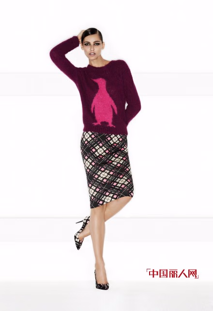 粉色格纹的铅笔裙与趣味图案毛衣的搭配,让整体造型优雅迷人的同时有了一丝活力,配上同款的铆钉格纹高跟鞋,打造与众不同的知性魅力!