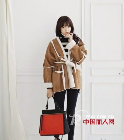 这件深驼色短款绒面外套,收腰效果极佳,门襟是开放设计的,有些欧美范,仅用腰带固定,很帅气的设计呢。内搭宽边条纹高领毛衣,下身配搭黑紧裤与坡跟裸靴,非常前卫时尚的搭配哦。
