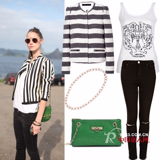 Louis Vuitton,Marc Jacos将条纹,棋盘式的格纹从冬天带到了这个夏季,Pierre Balmai白色虎头紧身背心搭配Topshop黑色紧身牛仔裤,有Zara条纹外套的加入,时尚度飙升。而一个绿色的DKNY链条包给整个look增加不止一点的跃动色彩!