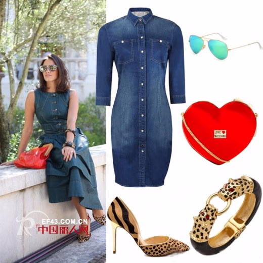 牛仔时尚永不过时!如果你想演绎80年代或者90年代的复古风,不妨选择像Paul By Paul Smith的七分袖牛仔裙,洗水做旧的效果帮你轻松找到这样的感觉,加入Guess拼接动物纹高跟鞋和Kenneth Jay Lane双花豹头手镯,不经意就增添了气场和女人味,而Love Moschino心形两用包则给复古look带来了玩味的小俏皮