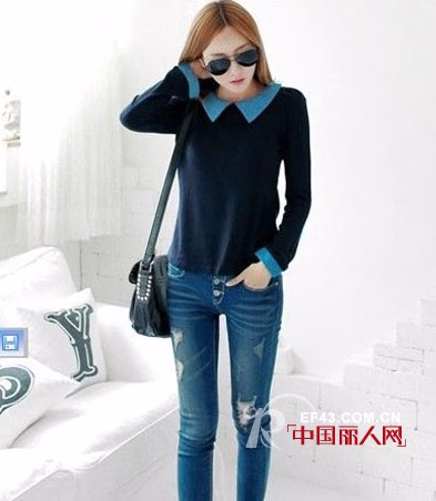 拼接款式的针织衫很适合单穿,养眼的深蓝色针织衫,浅色的衣领和袖口就很是吸睛好看,破洞的紧身牛仔裤搭配上黑色的短靴,简约风格的韩范儿搭配!