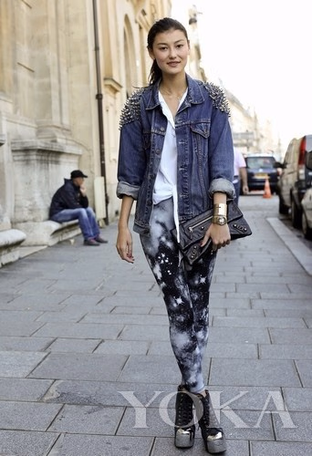 黑色手拿包凸显潮流品味牛仔外套搭配印花打底裤简约大方,黑色手拿包凸显潮流品味。