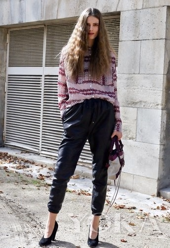迷你款机车包俏皮可爱粉紫色民族风款式衬衫搭配高腰哈伦裤凸显傲人身材,迷你款机车包俏皮可爱。