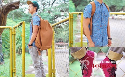 这款丹宁色印花衬衫,看上去十分新鲜。彩色的印花一解丹宁衫的硬朗感,让衬衫散发出满满的童趣和青春感。一个棕色双肩大包背出学院青年范,枣红色帆布鞋、棒球帽为造型出了不少力,让造型更加新潮。