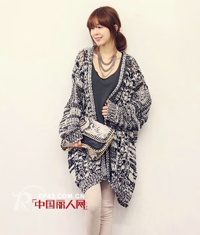 这款黑白杂色的针织开衫很显随意,落空的设计很是时髦有个性,蝙蝠衫的宽松款式,足够藏肉显瘦,这款的外套款式随意搭配上灰色的打底衫和白色铅笔裤,养眼好看!