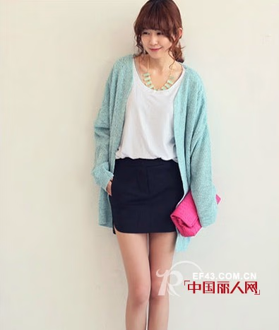 这款小清新薄荷绿的针织开衫显清纯气质,蝙蝠衫的款式成功藏肉,白色的简单打底衫搭配上黑色的包臀裙,知性中带着小女人的温婉,撞色搭配上玫红色的手包,时髦味十足!