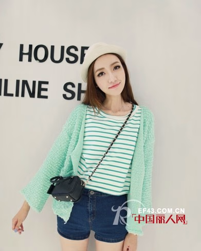 薄荷色针织外套,清新秀气的颜色,透着淑女气质。简约大方的风格,十分养眼呢。内搭同色系横条纹打底衫,下穿高腰牛仔短裤,帆布鞋,小挎包,很漂亮的风格,秀气逼人。