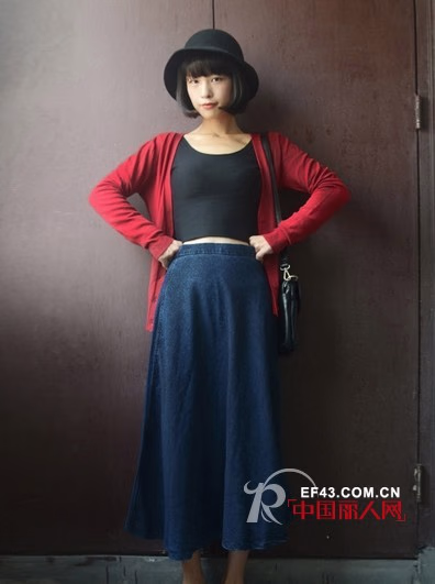 深红色针织开衫内搭黑色背心,下穿半身长长裙,牛仔裙质地,这身搭配很有文艺范儿吧。穿上复古单鞋,透着英伦风。