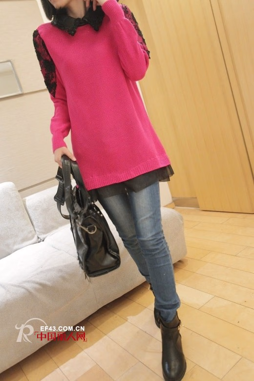 宽松的韩版针织毛衣裙,蝙蝠衫的版型设计遮挡拜拜肉、小肚腩,领部拼皮设计超显质感,肩袖及衣摆拼接蕾丝,更显层次感,下身自由搭配牛仔裤等单品,轻松百搭。