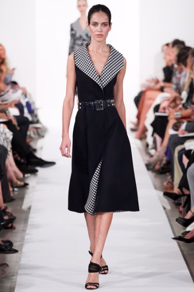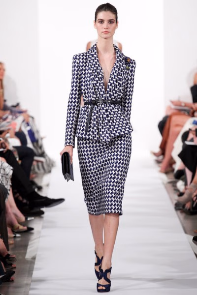 但是,设计绝不仅仅局限于伊丽莎白女王的古老时代风尚。比如开场的第一套时装,全然不见远古时期的风格,典雅的海军蓝夹克风衣剪裁干净,下装搭配色织格布及膝裙装,线条分外优雅。白色轮状皱领,刺绣,蕾丝,这些都是伊丽莎白时期服装经典的装饰手法,设计师de la Renta将它们与摩登线条轮廓相融合,使这些细节的美丽演绎得更加精彩,比如花呢西装上的凸纹花边领口设计,干净简洁。
