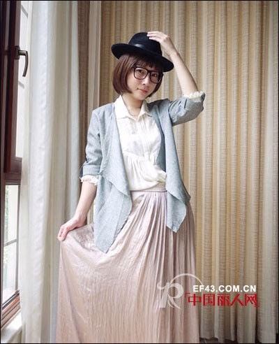银灰色小外套,翻领款式,大方好看,慵懒随性的感觉,气质极好。搭配白色衬衫,下穿裸粉色半身长裙,优雅大方,楚楚动人。