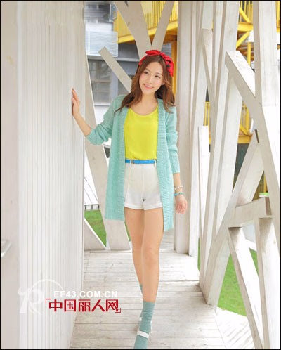 薄荷绿针织开衫,长款版型,慵懒随意。这是不少女孩秋季最喜欢的服装,应对早晚温差,必备哦。内搭柠檬黄色打底衫,下穿白色高腰短裤,配上白色高跟凉鞋,撞色搭配,温婉清新。