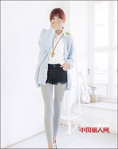 浅蓝色针织开衫搭配白色衬衫和黑色短裤,穿上浅灰色打底裤和黑色运动鞋,格外休闲的装扮,而且十分显瘦呢。