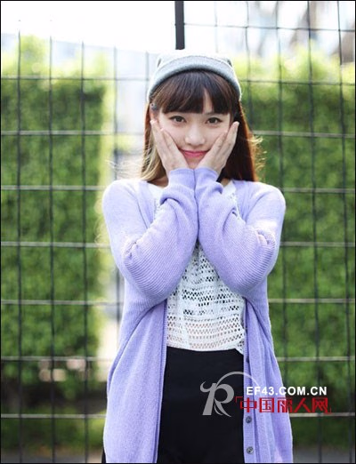 浅紫色针织开衫搭配透视感打底衫,配上黑色高腰短裤,如此清新脱俗的搭配,透着淑女气质,简约时髦,这是秋季最为流行穿法。