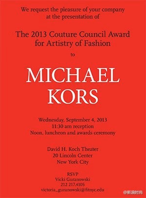 当地时间昨天中午,纽约的林肯中心举行了2013时装委员会风尚艺术家大奖的颁奖典礼以及午餐会,今年该大奖的得主Michael-Kors 以一身黑色休闲西装参加典礼。这也为即将开幕的2014纽约春夏时装周增添了几许热烈气氛。