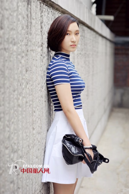 高领条纹短袖上装运用了修身的面料精致打造,及膝小白裙立刻让你的look拥有了无限的优雅味道,包袋的不同演绎方法颇具潮流感。