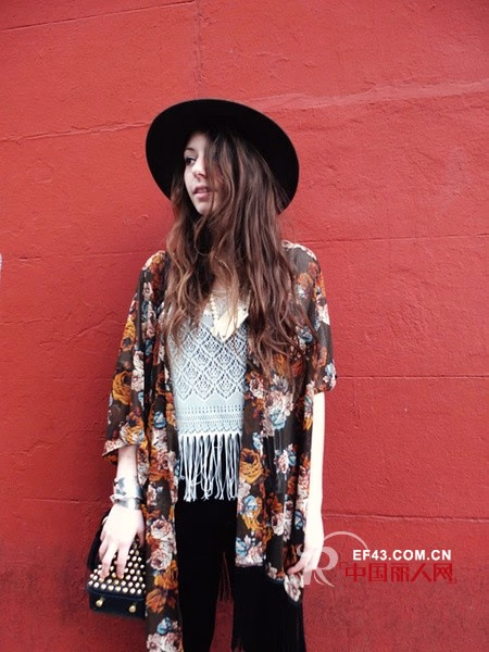 复古的宽松廓形罩衫采用了随身的面料来打造,内搭流苏款上装,营造了一种优雅的名媛气质,但是选择搭配宽毡帽&铆钉背包又融合着朋克的激情。