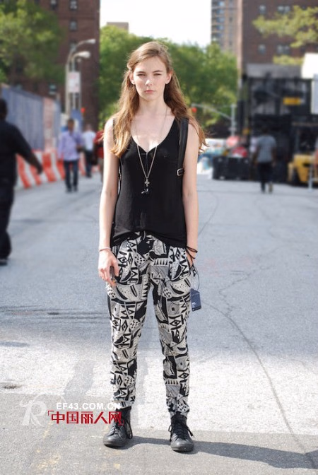 黑色无袖背心再普通不过,但是搭配不规则图案哈伦裤就是可以穿出时尚潮流范儿,再搭配一双马丁靴,颇具摇滚精神的look一气呵成。