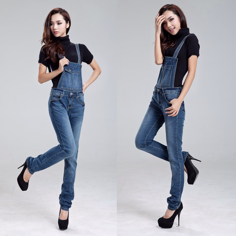 概述:一种吊带、连身的牛仔裤款式。