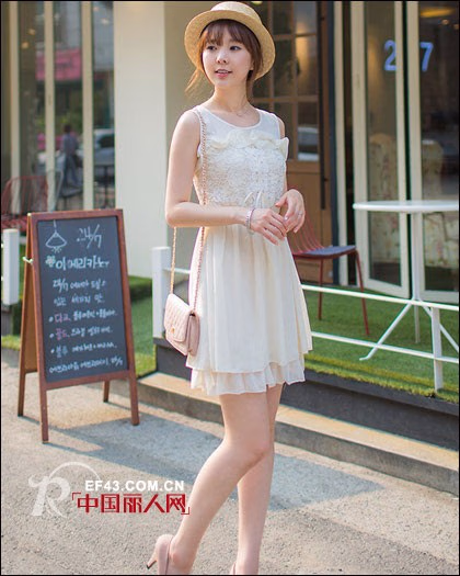 雪纺轻薄透气,清新可人的模样,让你在炎炎夏日也能"仙"一把!胸前的蕾丝增添小公主气质。裙摆的双层雪纺让裙子更飘逸垂坠,尽显活泼可爱。裸色鱼嘴高跟鞋展露趾尖的性感。