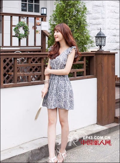 收腰的背心连衣裙,清凉舒适,时尚百搭,蓝色的裙子搭配上白色的印花,浪漫唯美,让MM们清纯的气质一展无遗,高腰的裙子搭配上撞色的坡跟凉鞋,轻轻松松为MM们打造窈窕好身材。