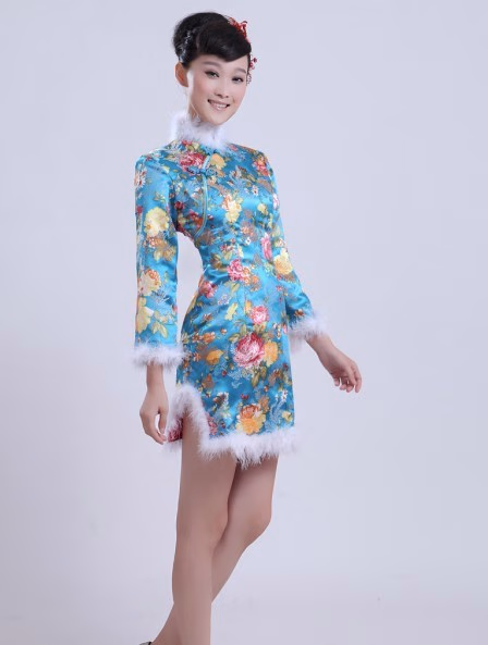 将旗袍大胆地设计成短款,更添性感味道。古色古香的刺绣,鲜艳的花朵图案衬托着女性最娇美的一面。毛绒的拼接让这件旗袍更有冬日的感觉,是不是让您有置身于宫闱之中的感觉呢!
