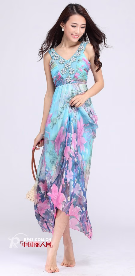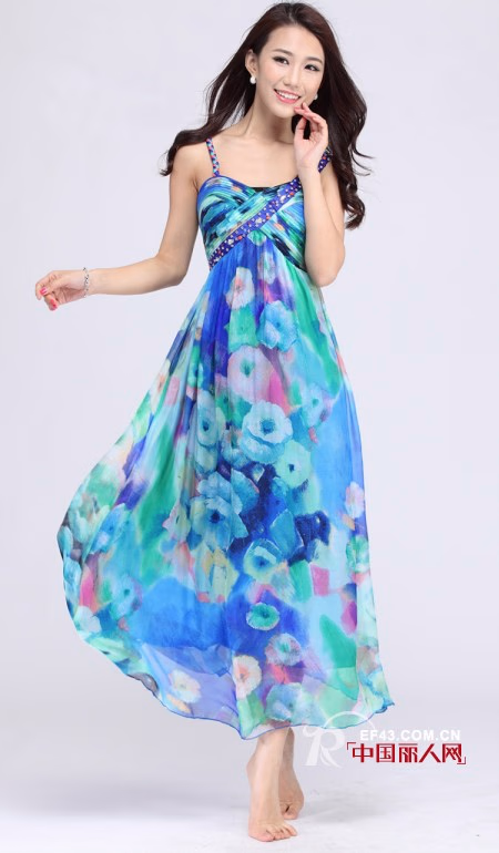 清新淡雅的湖水蓝衬托着斑驳的花朵印花,犹如置身于花海之中,给人以最大的美的享受。渐渐的V字领加上交叉型吊带,更显性感味道。胸部的钉珠点缀更显精致与奢华。