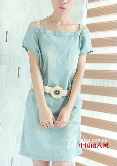 纯净的海蓝色是否已经把你带到湛蓝的海天一色的景象中,一字肩的造型如同和宽大的袖扣连接处一种娇媚的公主形象,整个裙身中参杂着水洗白碎片相融合,纯净感让人挥之不去,金属色的腰带将宽松的裙型收缩在腰间,顺便打造出一点腰身的弧度,轻松打造淑女形象。