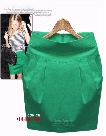 当然,在这个炎热的颜色,你可以尝试一下清爽的绿色。这件绿色的包臀短裙,在腰间的对称式褶皱形成灯笼形状的立体效果,巧妙的藏住小肚腩。营造干练气质,让您在职场中挥洒自如。