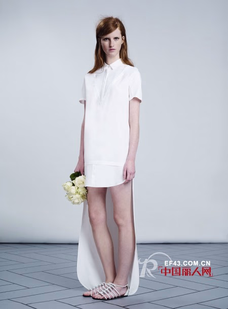 咋一看之下,这件看似像短袖衬衫的短裙,似乎很难和婚纱甚至婚礼联系在一起。除了这纯白的颜色,但仔细看,却可以看出独到之处。直筒式的短裙,工整的立领显得非常正式,在裙摆的后片特地加长,又渲染出别具一格的设计风格。是不是越看越有味道呢!