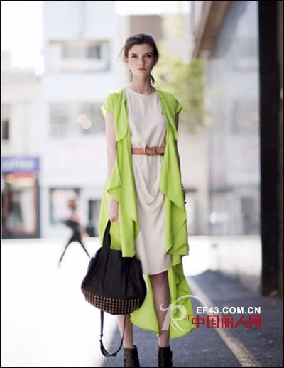 绝对气场的装扮,纯色系是最能体现小清新了,纯米色的H裙也能先出好身材,这款设计似乎也是简约到了极致,搭配一件极其个性的荧光绿荷叶边设计的开衫,清新夏日小清新帅气出街。