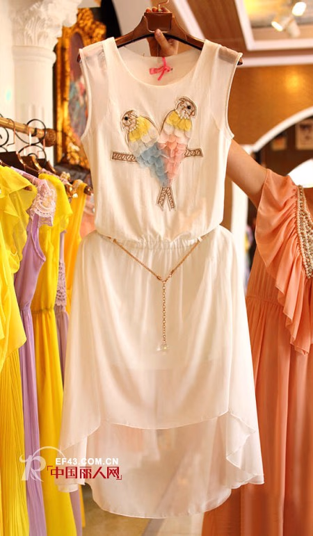 下半身珍珠麻纱雪纺,版型超级好,设计优雅大气,上身后特别有飘逸感,像清风一样,很美,复古立体刺绣鹦鹉图案也很有特色,特别赞的裙子。